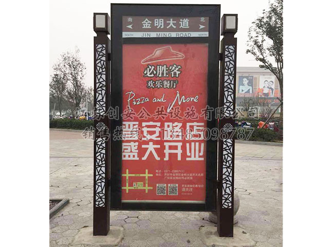 此款路名牌燈箱LMPDX-28采用鍍鋅鋼結(jié)構(gòu),表面采用氟碳金屬烤漆工藝,視窗面板采用鋼化玻璃,燈箱內(nèi)置LED燈。具有外形美觀、表面耐腐蝕、抗風(fēng)性能強(qiáng)、使用壽命長等優(yōu)點(diǎn)。產(chǎn)品的樣式、尺寸、顏色、材質(zhì)、配置等均可按需定制。