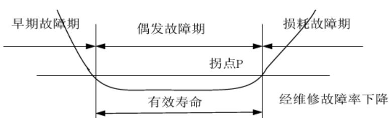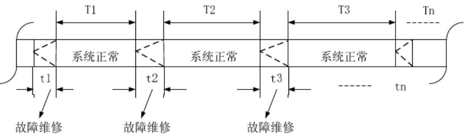 (1)可靠性,指某一時(shí)間段內(nèi)設(shè)備或系統(tǒng)連續(xù)運(yùn)行而無(wú)故障發(fā)生的概率。重要表征參數(shù)是平均無(wú)故障時(shí)間(Mean Time Between Failure,簡(jiǎn)稱(chēng)MTBF)是指相鄰兩次故障之間的平均工作時(shí)間,也稱(chēng)平均故障間隔時(shí)間。如圖1所示MTBF= ,系統(tǒng)故障率λ= 1/MTBF。