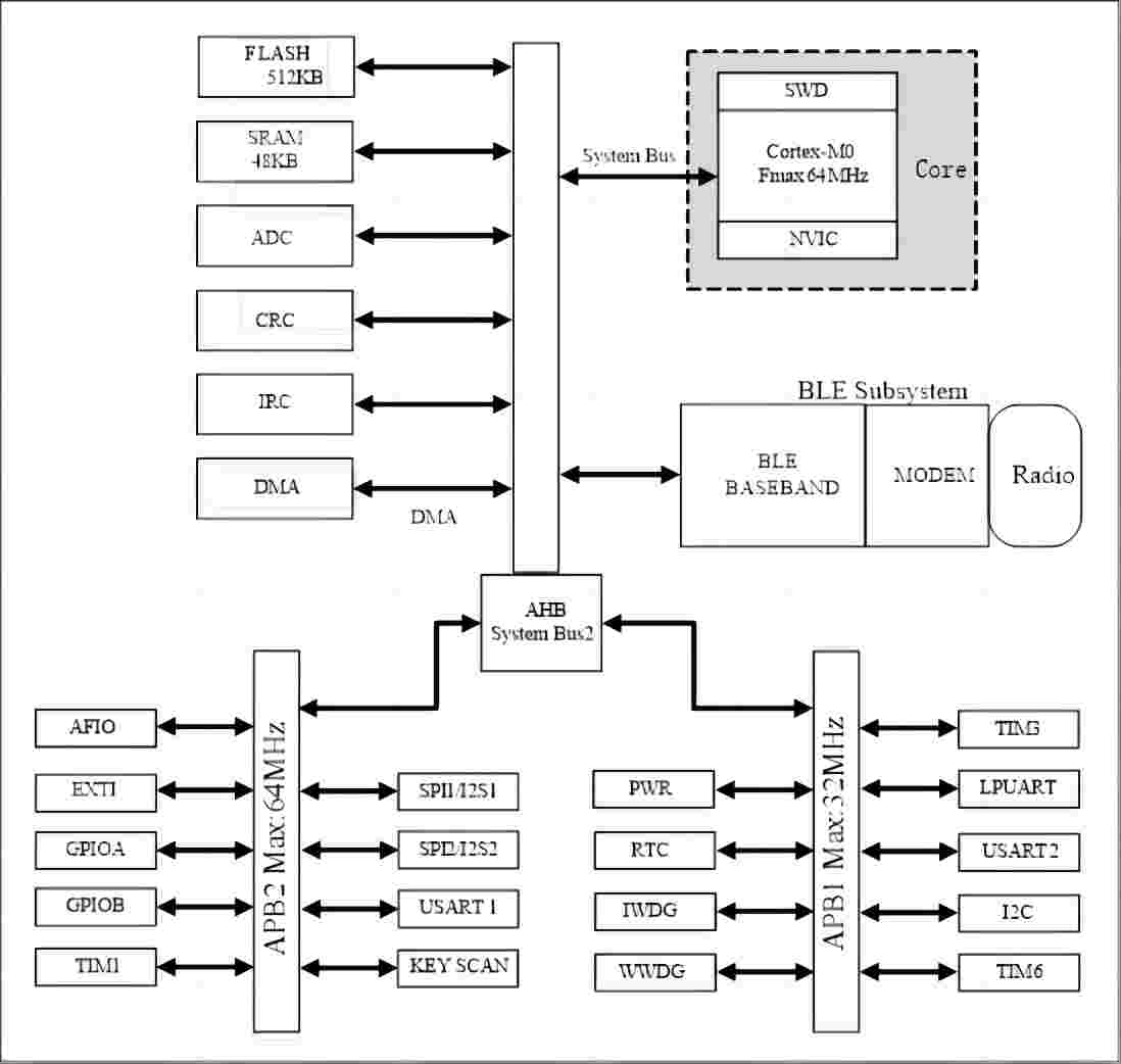 集成先進(jìn)的BLE5.1射頻收發(fā)器,符合藍(lán)牙BLE5.1規(guī)范,可配置為標(biāo)準(zhǔn)的1MbpsBLE模式,2Mbps增強(qiáng)BLE模式,125kbps BLE遠(yuǎn)程模式(S8),500kbps BLE遠(yuǎn)程模式(S2)。在BLE1M或2M模式下,支持AOA(到達(dá)角)和AOD(離去角),支持RSSI(接收器信號(hào)強(qiáng)度指示),支持主從角色,支持多連接,支持?jǐn)?shù)據(jù)包長(zhǎng)度擴(kuò)展,支持KEYSCAN,IRC,10位1.33Msps ADC(可配置為16位16Ksps),支持模擬MIC輸入,PGA放大,支持基本、通用、高級(jí)TIMER,RTC,WWDG,IWDG,LPUART,USART,SPI,I2C等外設(shè)。適用于藍(lán)牙KEY,OBU,數(shù)傳模塊,藍(lán)牙語(yǔ)音遙控器,智能家居等多種應(yīng)用場(chǎng)景。