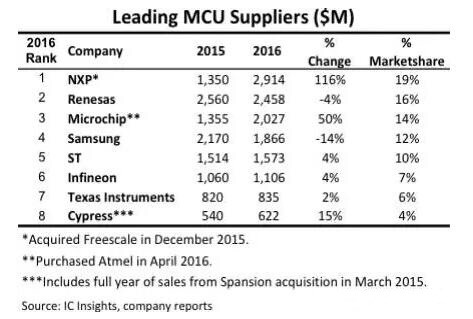 隨著物聯(lián)網(wǎng)領(lǐng)域應(yīng)用對MCU需求的進(jìn)一步增長。為了搶占市場份額,供應(yīng)商們進(jìn)行了多次的并購,并最終改變了MCU的供應(yīng)商排名。根據(jù)IC Insights的統(tǒng)計,全球最大的MCU供應(yīng)商由收購了Freescale的NXP擔(dān)當(dāng),而Microchip、Cypress也通過收購,提高營收,擴大了在MCU市場的份額。但因為在2016年,MCU的增長并沒有那么明顯,那就沒有更多的收購事件發(fā)生。