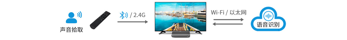 對于智能語音遙控器,用戶按下語音識別鍵后,遙控器告知電視啟動語音識別功能,同時拾取用戶語音,將音頻數據發(fā)送至電視,電視根據云端識別結果執(zhí)行節(jié)目搜索或打開相關應用。