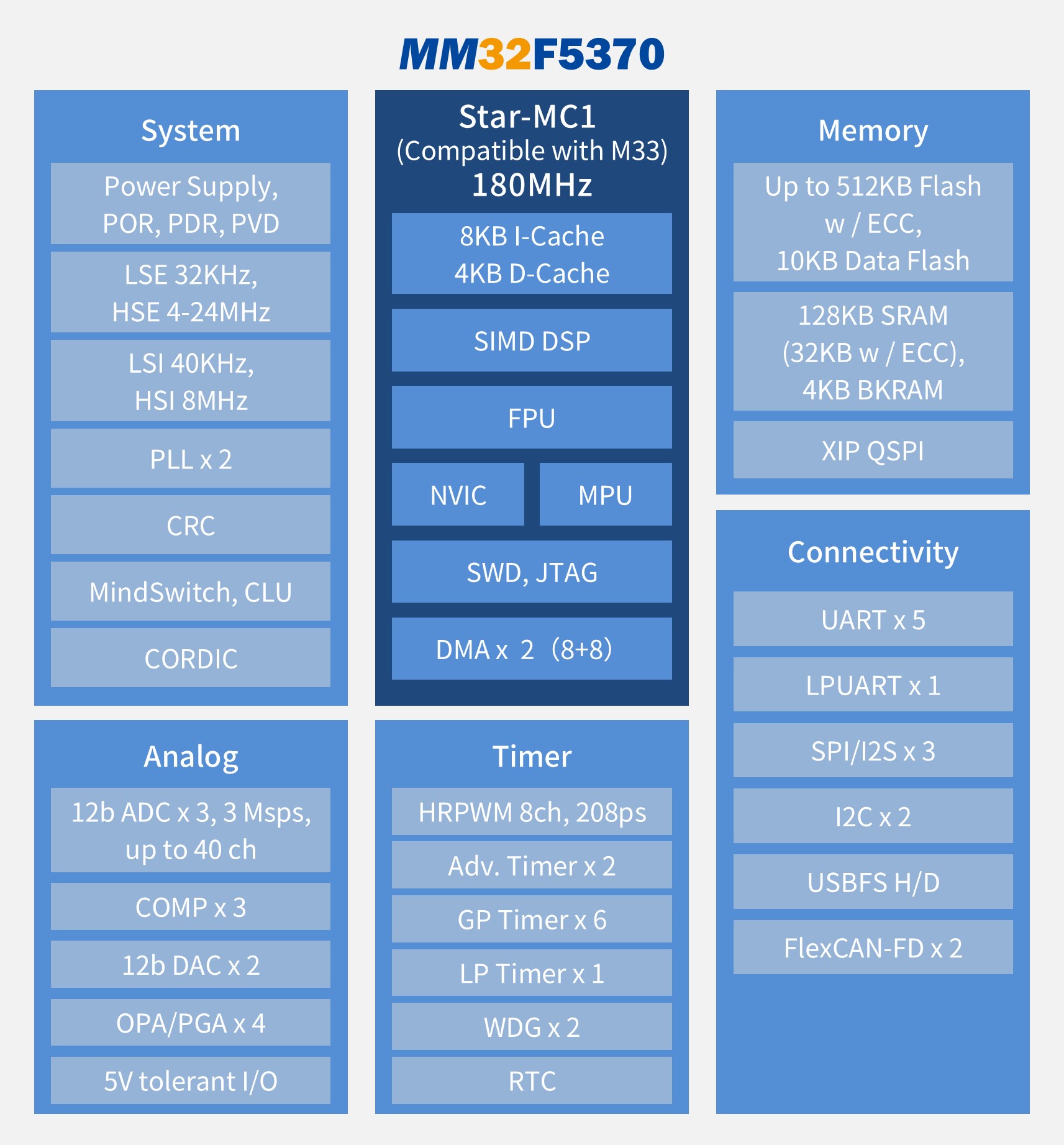 MM32F5370搭載國產(chǎn)Star-MC1內(nèi)核,基于Armv8-M架構(gòu),指令集兼容Cortex-M33,提供高達512KB flash,支持ECC,并提供分區(qū)讀保護,支持代碼二次開發(fā),保護方案商利益;另有10KB Data Flash,獨立分區(qū)。提供高達128KB SRAM,其中32KB支持ECC;另有4KB retentionRAM,可在Standby模式下對數(shù)據(jù)進行保持。提供QSPI外部存儲擴展接口,并支持XIP。該型號滿足三電機應(yīng)用的實時控制需求。
