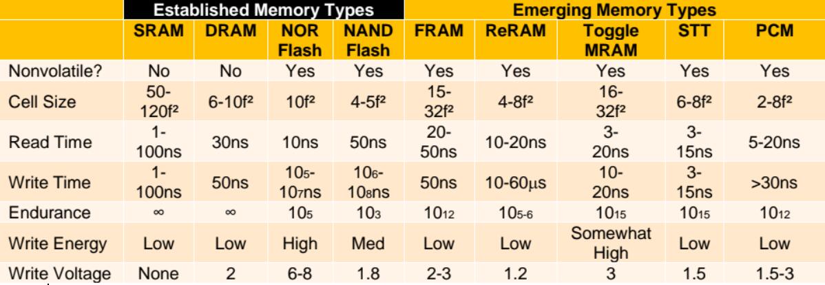 當前存儲器和新興非易失性存儲器技術的特點