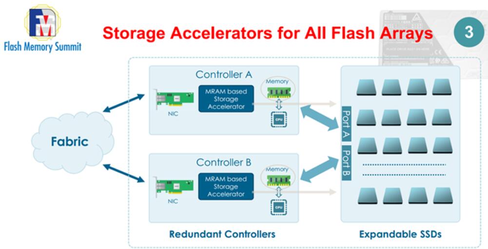 在全閃存陣列的存儲控制器中,MRAM可以作為緩存加速,并提升產(chǎn)品性能及可靠性,同時(shí)可以不需要額外的電池或者電容。