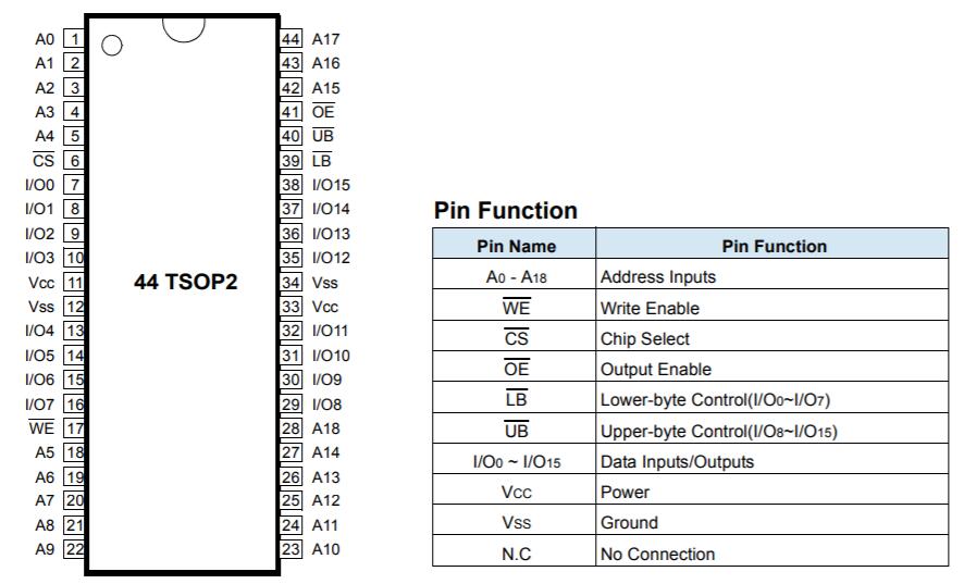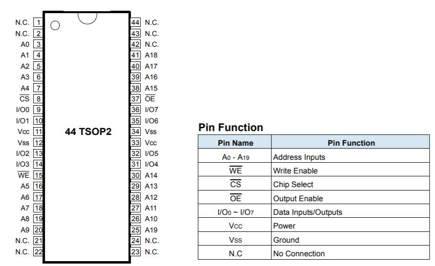 •標準的44TSOP2和48FBGA封裝引腳配置。