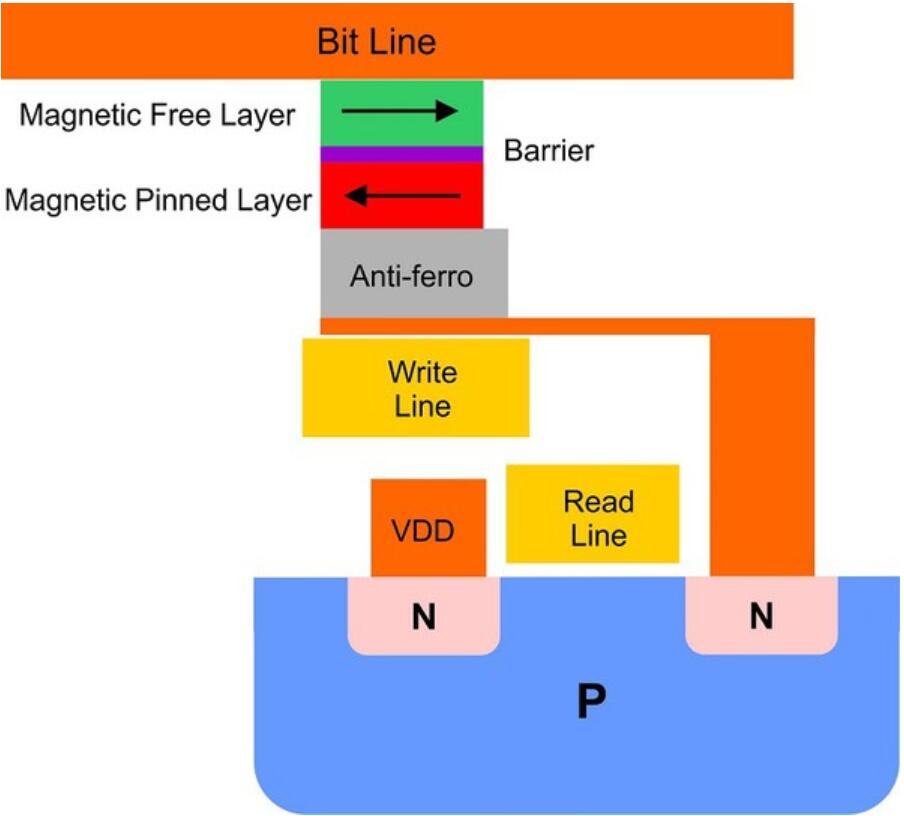 •具有成本效益----簡(jiǎn)單到只有一個(gè)晶體管、一個(gè)磁性穿隧結(jié)(1T-1MTJ)位單元;