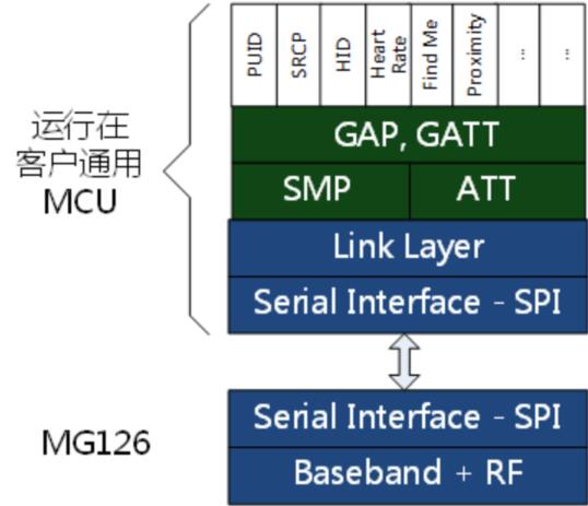 MG126使用獨(dú)創(chuàng)的創(chuàng)新架構(gòu)設(shè)計(jì),采用常見的SPI通信接口,芯片本身不需要額外的喚醒信號(hào)已節(jié)省MCU IO資源。前端芯片包含RF和BLE數(shù)字基帶,完成BLE廣播和數(shù)據(jù)的接收/發(fā)送和調(diào)制/解調(diào)以及基帶數(shù)據(jù)轉(zhuǎn)換。BLE協(xié)議棧運(yùn)行在MCU上,復(fù)用MCU強(qiáng)大的處理和控制能力,提高了MCU的資源利用率。該芯片采用QFN16封裝,體積只有3mmX3mm。